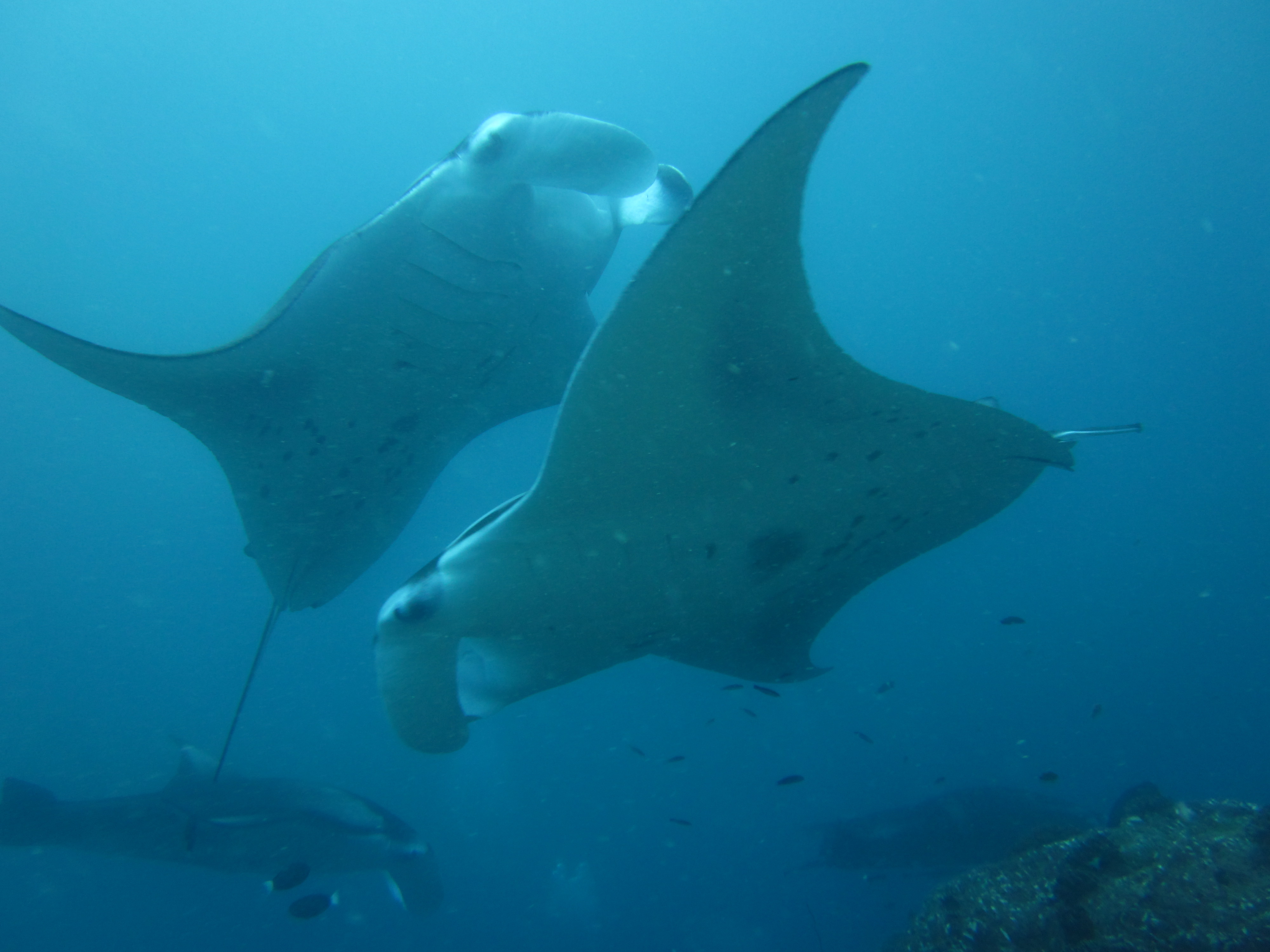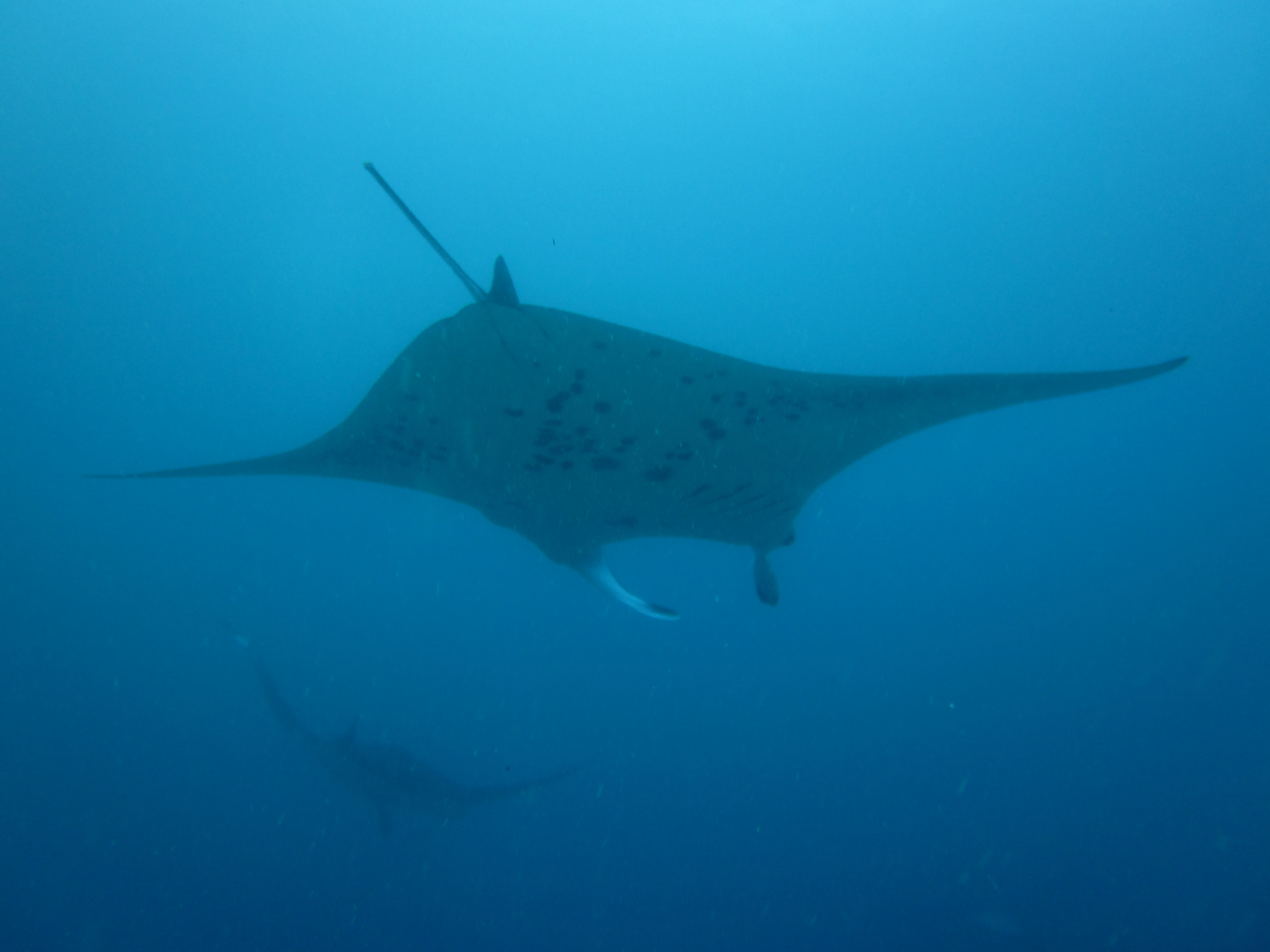 Pero el resultado superó cualquier expectativa. Nada más bajar vimos dos mantas acercarse con tranquilidad, pasar por encima nuestra proyectando su sombra y, girando lentamente, dejar que las rémoras se les adhiriesen. Era la primera vez que veía una manta mientras buceaba y son pura elegancia, planeando majestuosamente y con movimientos eficientes y fluidos.