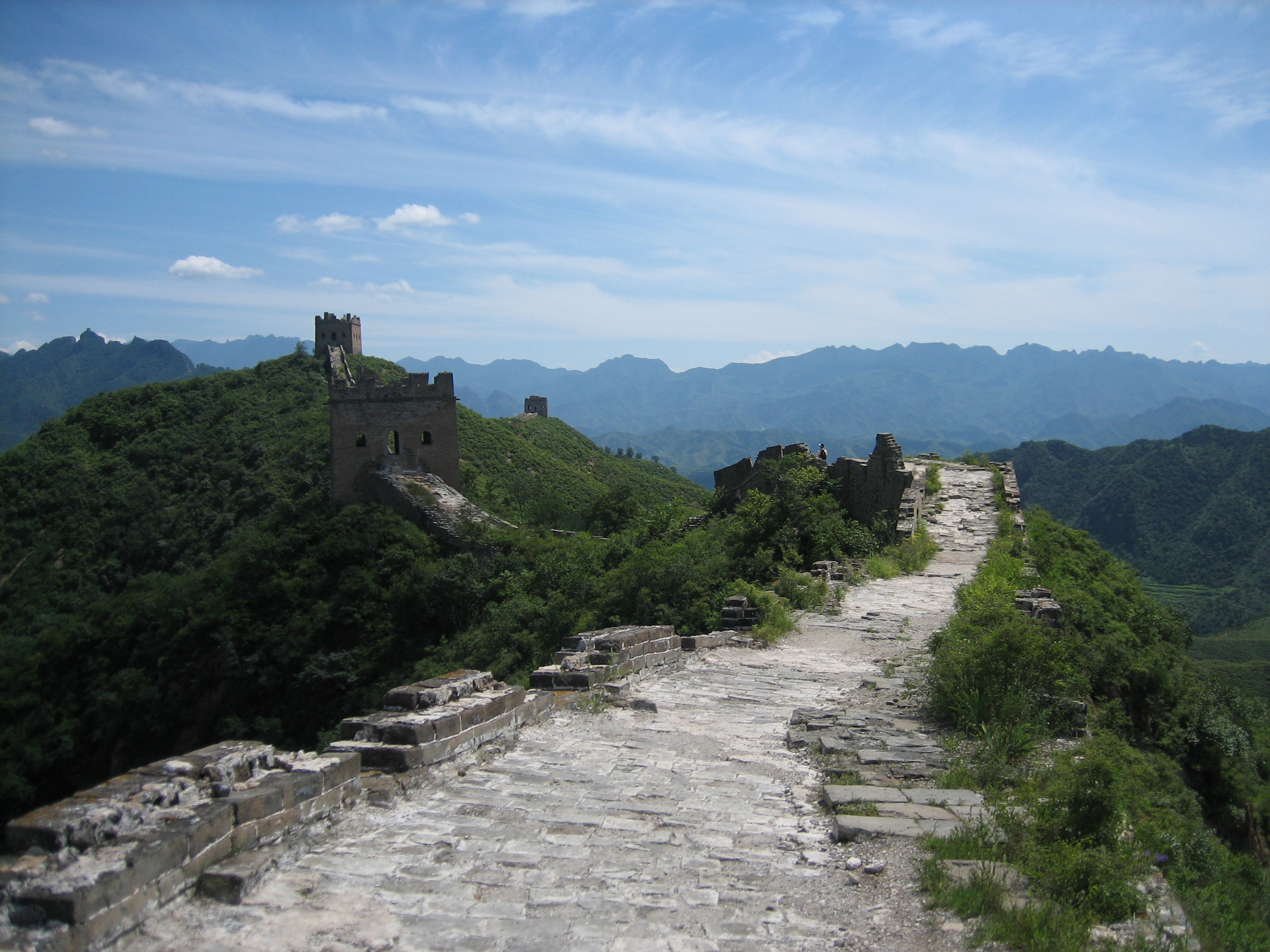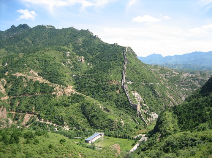 Retomando el relato donde lo empecé, llegó el gran día y yo estaba para pocas historias. Tocaba levantarse a las 6 y media, con apenas dos horas de sueño y la cabeza como un bombo.  Éramos 6 en nuestro grupo. Salimos a las 7 hacia Jinshanling, que está a unos 125 Km al noreste de Beijing y el viaje en la furgoneta duró casi 4 horas, incluyendo una parada en un supermercado (el conductor no hablaba casi inglés pero nos dijo «very hot, very drink») y otra para que la poli le pusiera una multa por adelantar por la derecha. Tardamos un buen rato en salir de la ciudad, aun a esa hora había un tráfico considerable. Por donde pasábamos estaba todo lleno de grúas, lo que se acentuó todavía más en las afueras de la ciudad, que no eran nada bonitas: pisos nuevos casi sin habitar mezclados con otros a medio construir y otros cayéndose a pedazos, grandes descampados y pedregales secos bajo el calor de agosto.Y grúas, muchas grúas, que los Juegos Olímpicos estaban a la vuelta de la esquina.  Según nos acercábamos a nuestro destino el terreno se hacía mas montañoso y un poco más verde, con arbustos y matorrales en las laderas de las colinas.