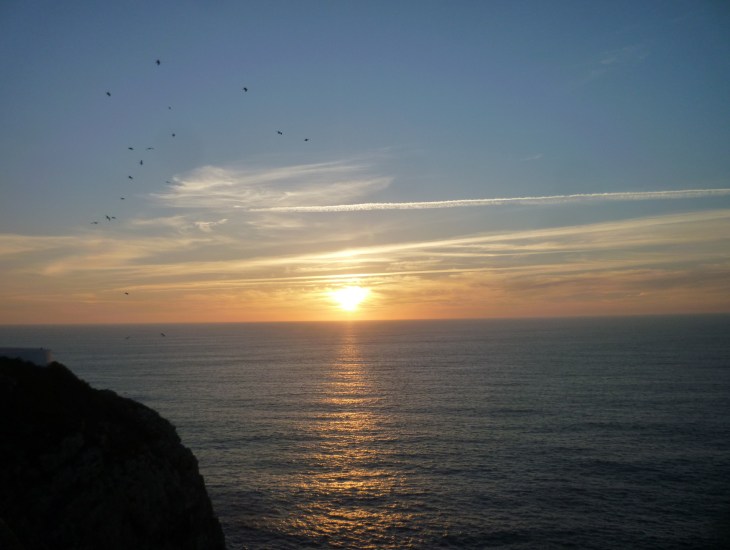 2.- La puesta de sol desde el Cabo de San Vicente: desde el extremo del Cabo, en el que hay un faro, hay una de las puestas de sol más famosas y espectaculares de Europa. Nada (salvo cuando hay nubes, claro) entorpece la vision del sol hundiéndose en pleno océano Atlántico. Suele haber mucha gente cualquier día que haga buen tiempo y se pone hasta los topes cada atardecer del verano, por lo que es recomendable ir con algo de tiempo para coger sitio. A veces la gente lleva bongos y otros instrumentos de percusión para marcarle el ritmo al sol en su descenso y celebrar la despedida de otro dia vivido. Una vez que el sol se ha ido a descansar hasta el día siguiente los espectadores suelen romper a aplaudir. En verano hay tenderetes que venden ropa, comida y souvenirs. Por muy buen día que haya hecho, al anochecer suele pegar mucho el viento y hacer fresco (o frio directamente), así que mejor llevar algo de abrigo. Como curiosidad la carretera que sale de Sagres y va hacia el Cabo termina allí, sin posibilidad de seguir hacia ningún lado.