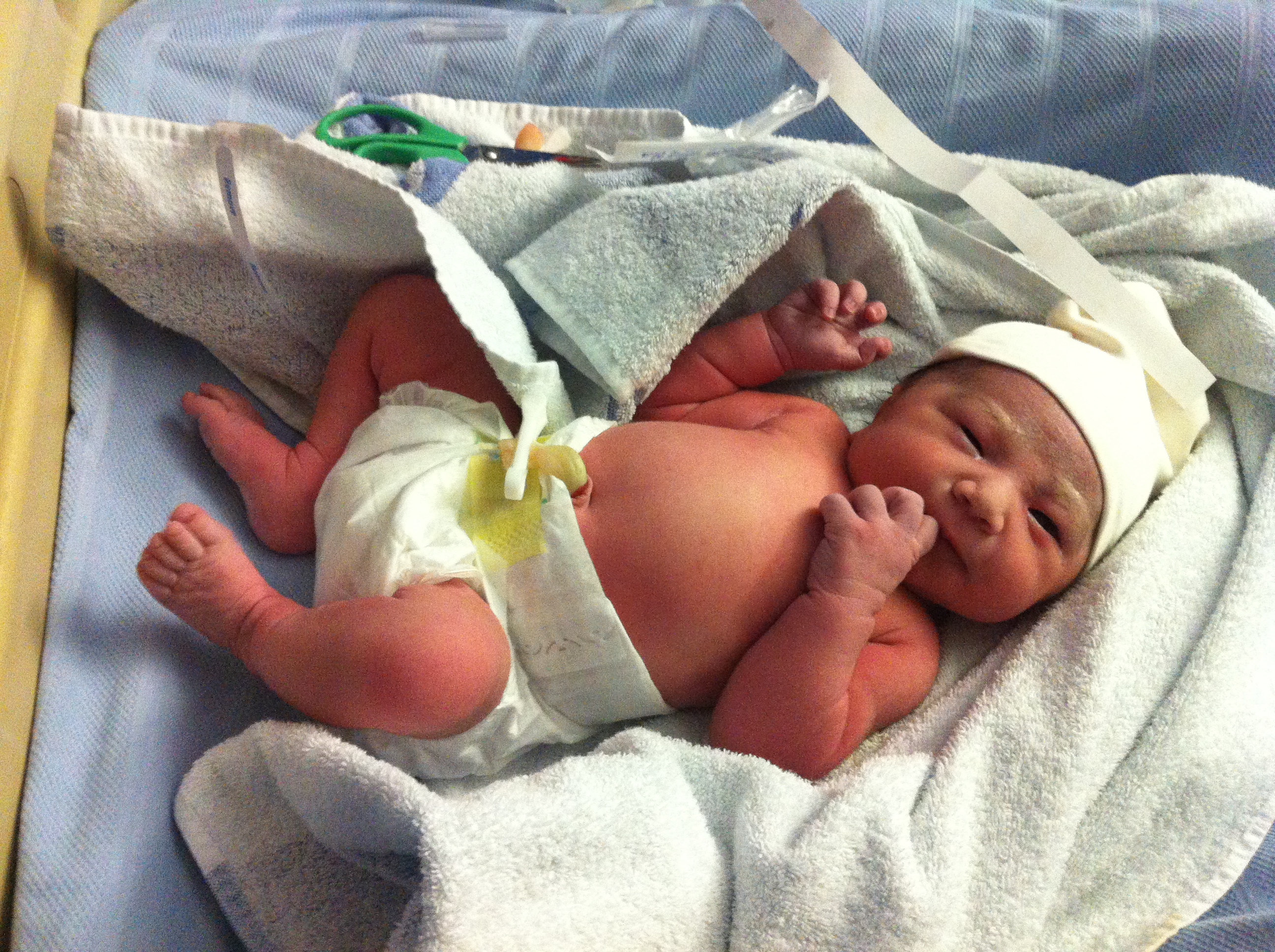 Nos trasladaron a la zona de neonatos (compartida con otra persona) y la midwife cogió a Sakura para medirla (49cm), pesarla (3,240Kg), contarle los dedos de las manos y los pies (20) y hacer un chequeo general para asegurarse que ha salido con todo el equipo necesario puesto. Unos instantes más tarde le pusieron su primer pañal y posó para la foto de abajo y…continuará…
