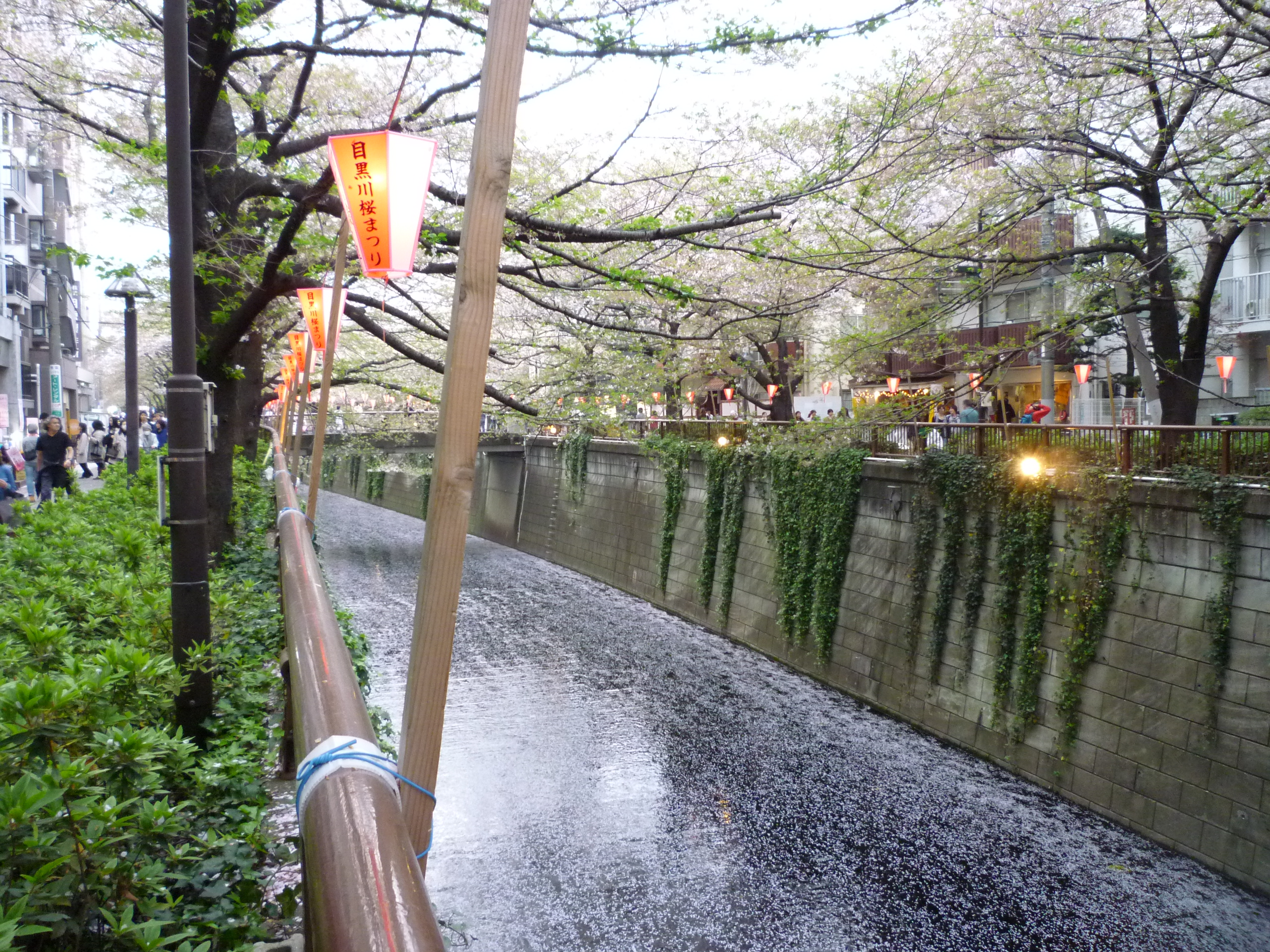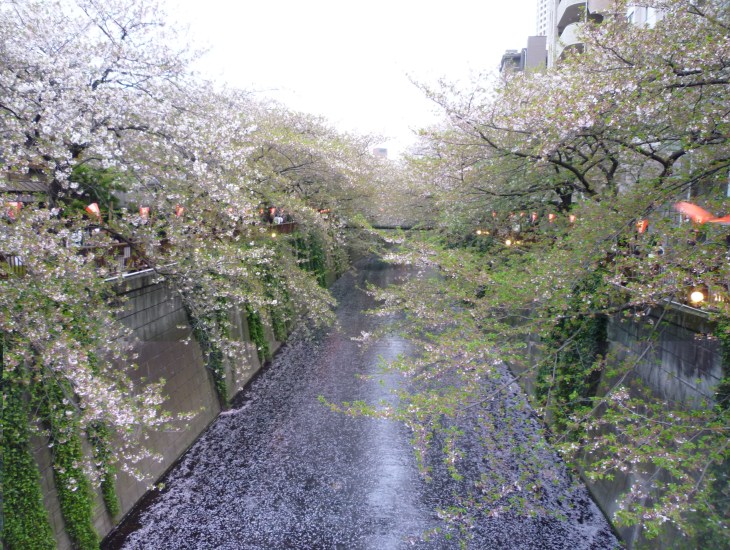 Volvamos a Nakameguro.  Nakame, como es conocido entre los tokiotas, es un tranquilo barrio residencial de la capital que se ha convertido en uno de los sitios de moda al que ir de hanami sobre todo entre gente alrededor de la treintena. Su momento de gloria ocurre durante la parte final del sakura – llamada chirisakura – cuando los pétalos de las flores empiezan a caer. Lo que lo hace tan especial es el paso del rio Meguro por la calle principal. El cauce está confinado en un estrecho canal delimitado por altas paredes de cemento, rematadas por una barandilla metálica desde la que se deslizan enredaderas hasta tocar el rio. A ambos lados del canal hay decenas de robustos cerezos que se inclinan como si quisieran asomarse a ver el agua. Las ramas de los árboles de ambas orillas se entrecruzan en el aire formando una especie de túnel natural bajo el que discurre el rio. Cuando llega el sakura, en las hasta entonces desnudas ramas se produce una explosión de vida y los cerezos casi parecen doblarse para poder aguantar el peso de los miles de frágiles pétalos. Pero el espectáculo inolvidable es descubrir que el agua del Meguro ha desaparecido casi por completo, tapada por una alfombra móvil de pétalos blancos y rosáceos que se desplaza perezosamente corriente abajo.