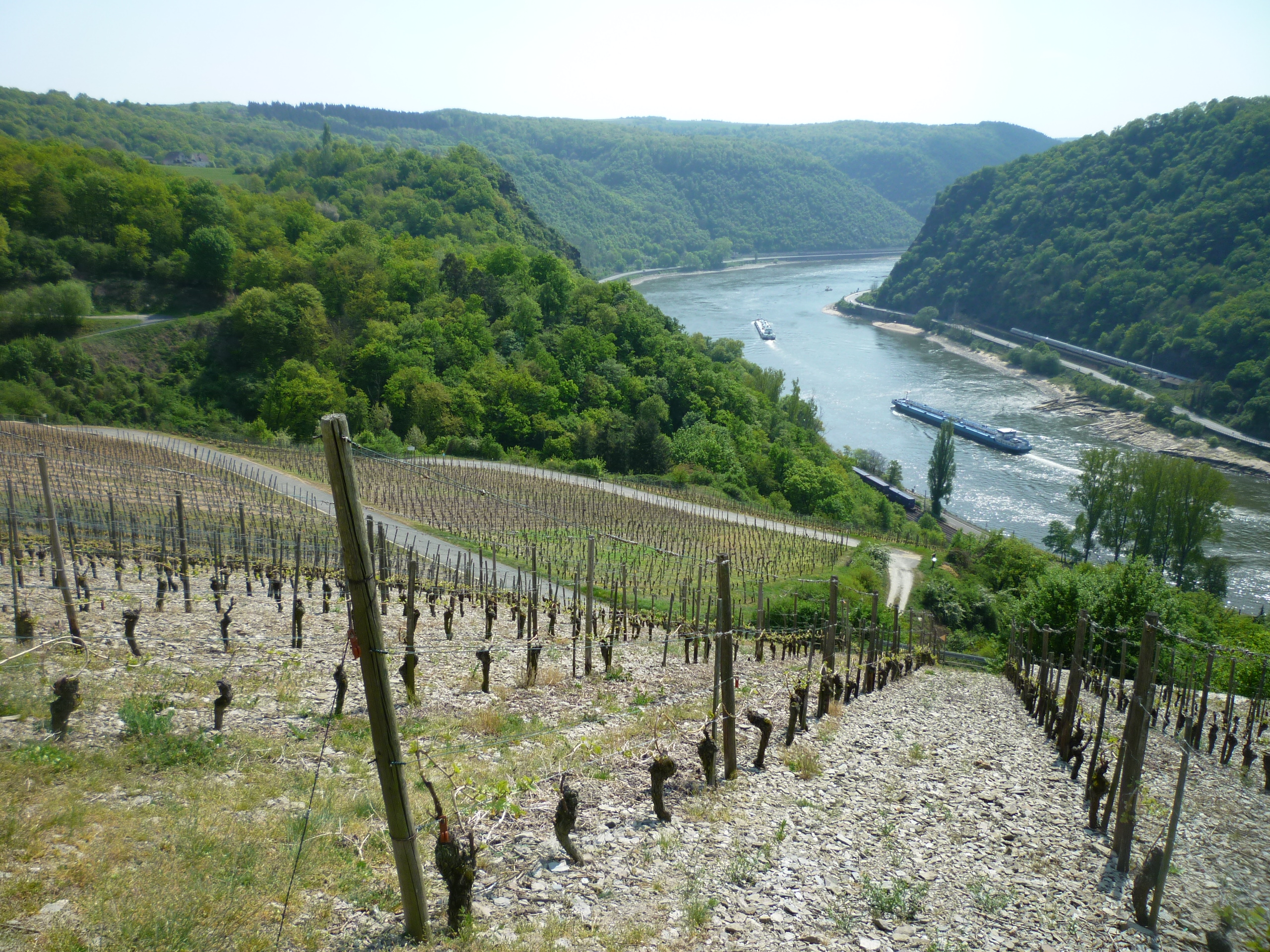 Retomamos el camino hacia el sur y pasamos por zonas en las que había los famosos viñedos de la región (Mittelrhein), cultivados en terrazas creadas en las empinadísimas laderas y que parecen estar casi suspendidas. Merece la pena pararse a verlos porque además el panorama es fantástico al no tener vegetación obstruyendo la vista. Conduciendo despacio pero sin pararnos hicimos los 25 Km que separan Braubach de Sankt Goarshausen donde volvimos a coger el ferry para volver a la orilla Oeste. El pueblo al que se cruza  está justo enfrente y se llama Sankt Goar, a la sombra de las impresionantes ruinas del castillo de Burg Rheinfels. Al salir de Sankt Goar, donde no paramos, vimos la famosa roca de Lorelei en la otra orilla. Aquí es donde el Rin alcanza su punto más estrecho pero la fama le viene por ser el lugar que ha inspirado diversas historias folclóricas y mitológicas.