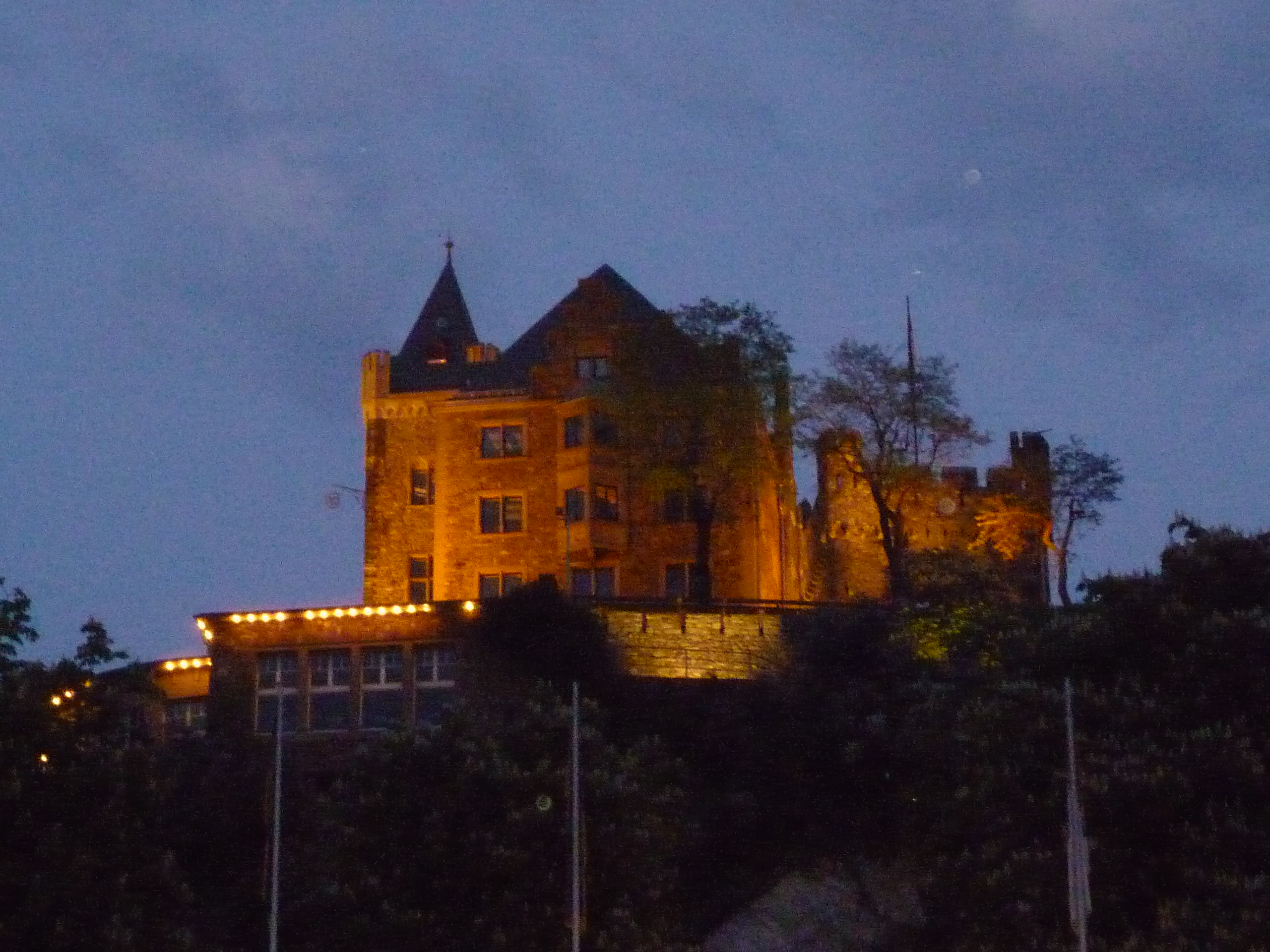 Bajando de nuevo por la orilla izquierda no nos paramos tampoco el siguiente pueblo, Oberwesel, y lo hicimos para comer (un buen restaurante italiano en una de las casitas típicas pero no recuerdo el nombre) en el pequeño y coqueto Bacharach. Después de comer subimos andando (15 minutos) a ver el sobrio y señorial  castillo de Burg Stahleck. Construido alrededor de 1135, fue destruido en 1689. El castillo actual es una reconstrucción hecha en el primer cuarto del siglo XX. A principios de los 30 se convirtió en la estrella de la red de albergues juveniles alemana, lo que sigue siendo hasta hoy. Merece la pena intentar reservar con antelación (está muy demandado) porque tanto el castillo como las vistas son sobresalientes. Nos tomamos una cerveza en la terraza que era la antigua plaza de armas y nos supo a gloria.