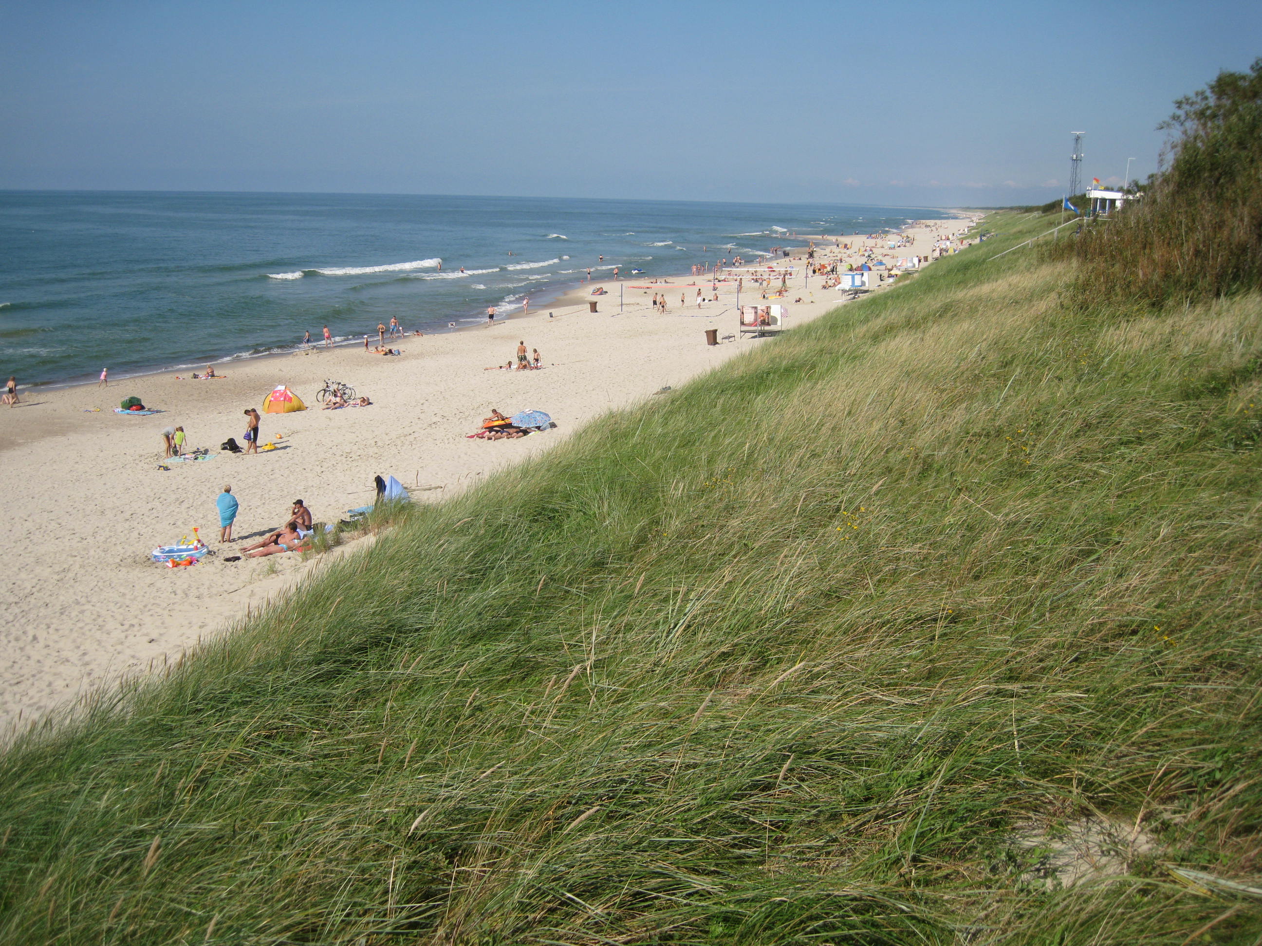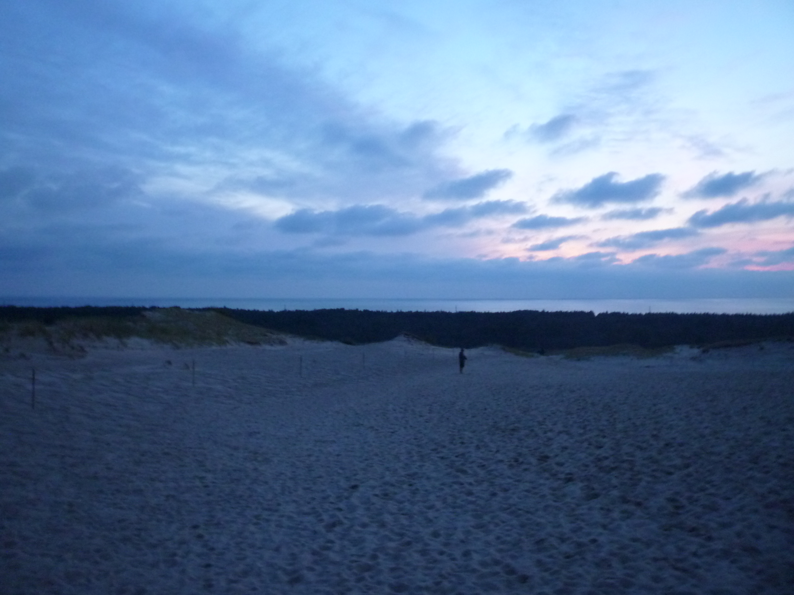 Apenas llevábamos un par de horas y ya teníamos claro por qué el Istmo de Curlandia está tan solicitado como destino turístico: la playa de arena fina que discurre ininterrumpida durante 98 kilómetros es magnífica. La separa de la carretera una línea de dunas bajas que me recordaban mucho a la costa de “mi” Huelva. Además, contrariamente a lo que pueda parecer, la temperatura del agua era estupenda, al menos en verano. Al ser la playa tan extensa y ancha se estaba de maravilla aun siendo temporada alta. Me llamaron la atención los curiosos cambiadores cilíndricos plantados en medio de la arena y que solo cubrían hasta la cintura. También me resulto curioso que había partes de la playa reservadas a mujeres o a hombres, con lo que tuvimos que buscar una zona mixta.