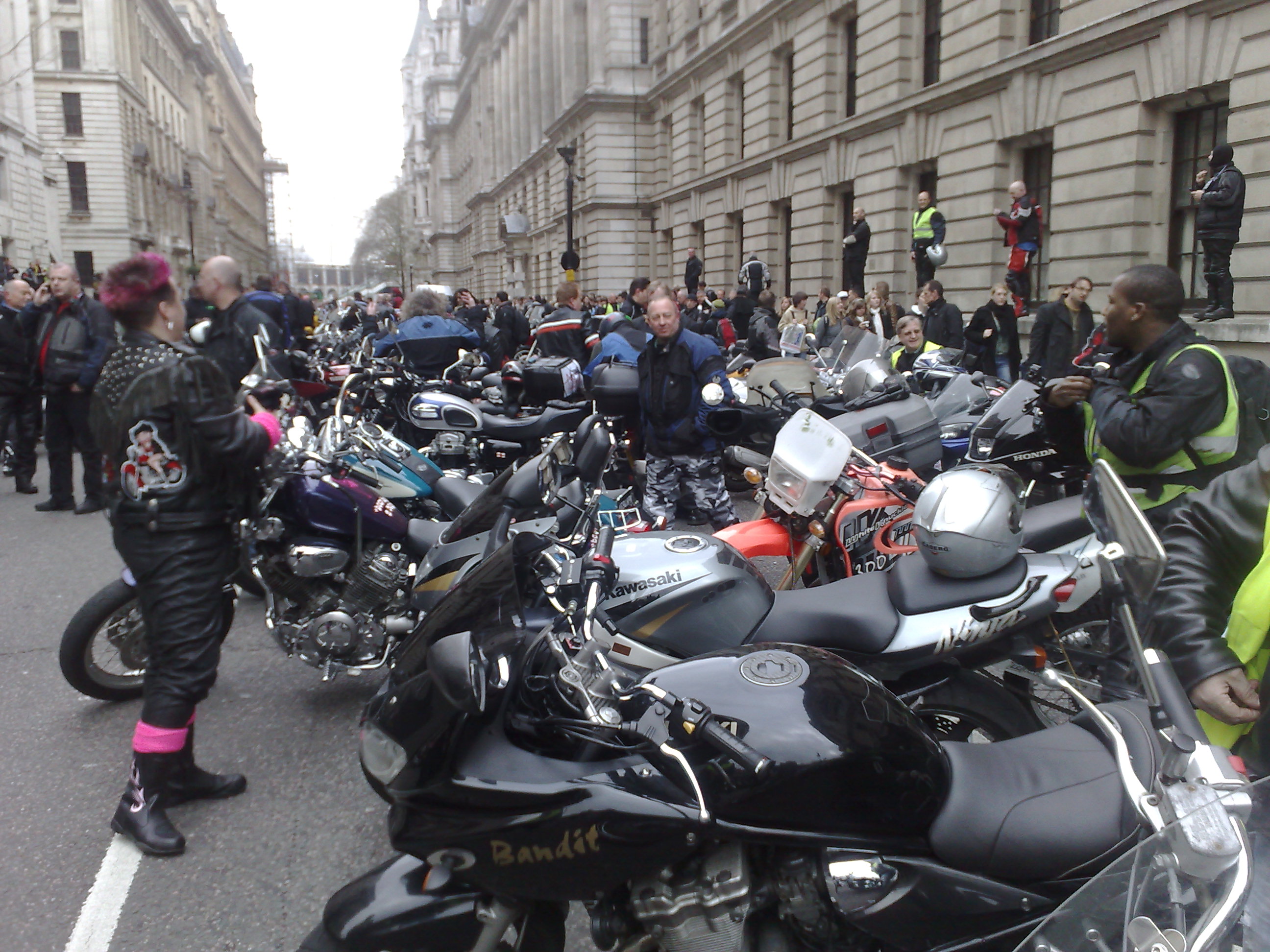 Aunque no todo han sido gestos bonitos: como las motos no pagan el congestion charge (tasa por circular por el centro de la ciudad, que actualmente asciende a £10… ¡por día!) en el ayuntamiento de Westminster se sacaron de la manga una tarifa por aparcar en las áreas reservadas a motos, que antes eran gratis. Eso irritó sobremanera a muchos moteros (yo incluido) y desde entonces ha habido varias concentraciones en pleno centro, en las que cientos de motos colapsaron el tráfico durante un par de horas. Yo estuve en dos de ellas, muy ruidosas pero pacíficas y tranquilas, con la policía colaborando sin ponerse agresivos. No se consiguió quitar la tasa pero se bajó de £1.5 a £1 por día. Las protestas de asociaciones y particulares continúan, aunque no creo que se consiga que el borough de Westminster acceda a perder semejante fuente de ingresos.