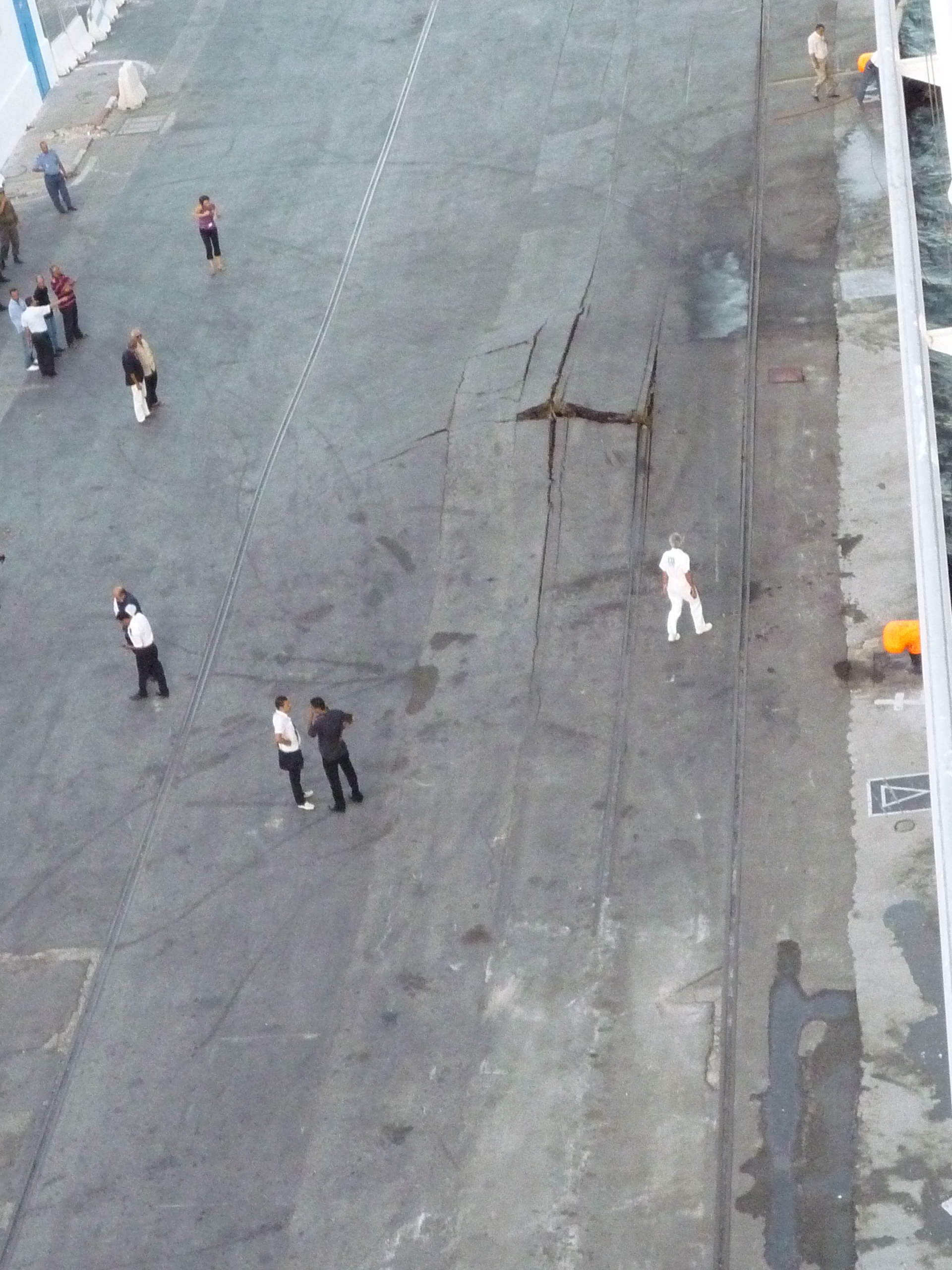 Antes de que el Costa Concordia pusiera de moda lo de empotrar cruceros, yo fui testigo de uno…y desde dentro del barco. Salíamos de La Goulette y subí a la cubierta superior para observar la maniobra. Ante mi asombro el barco se iba escorando más y más hacia el muelle para finalmente embestirlo en diagonal con una fuerza considerable. Mientras en el barco cundía el desconcierto y algo de pánico (en el restaurante se formó una buena), el impacto había abierto dos grietas en el pavimento del muelle. La más grande fue la de la foto que, aunque quizás no se aprecie bien por la perspectiva, alcanzaba fácilmente el metro de altura. Cinco horas estuvimos parados allí hasta que se aseguraron que no íbamos a ser otro Titanic y pudimos reanudar la marcha. Con un buen tema de conversación en el ascensor, eso sí.