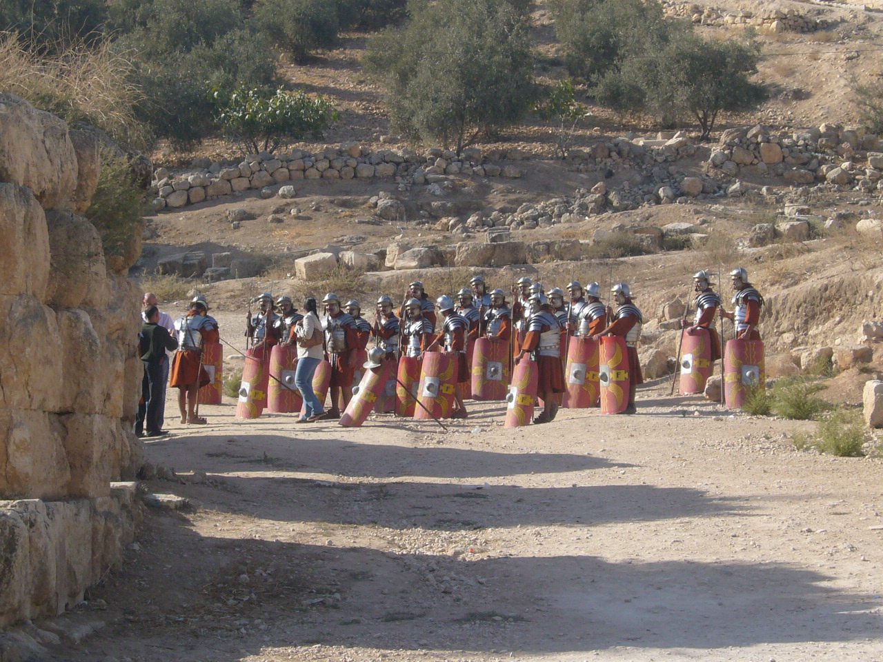 Las ruinas romanas de Jerash, al norte de Amman, son una de las mejores que he visto nunca. En el magníficamente conservado estadio se hacen carreras de cuádrigas y se representan luchas de gladiadores. Uno de los puntos fuertes del show es un grupo de legionarios recreando los ejercicios y movimientos de las legendarias e invencibles legiones romanas. Les hice una foto cuando esperaban tranquilamente su turno para hacer la testudo.