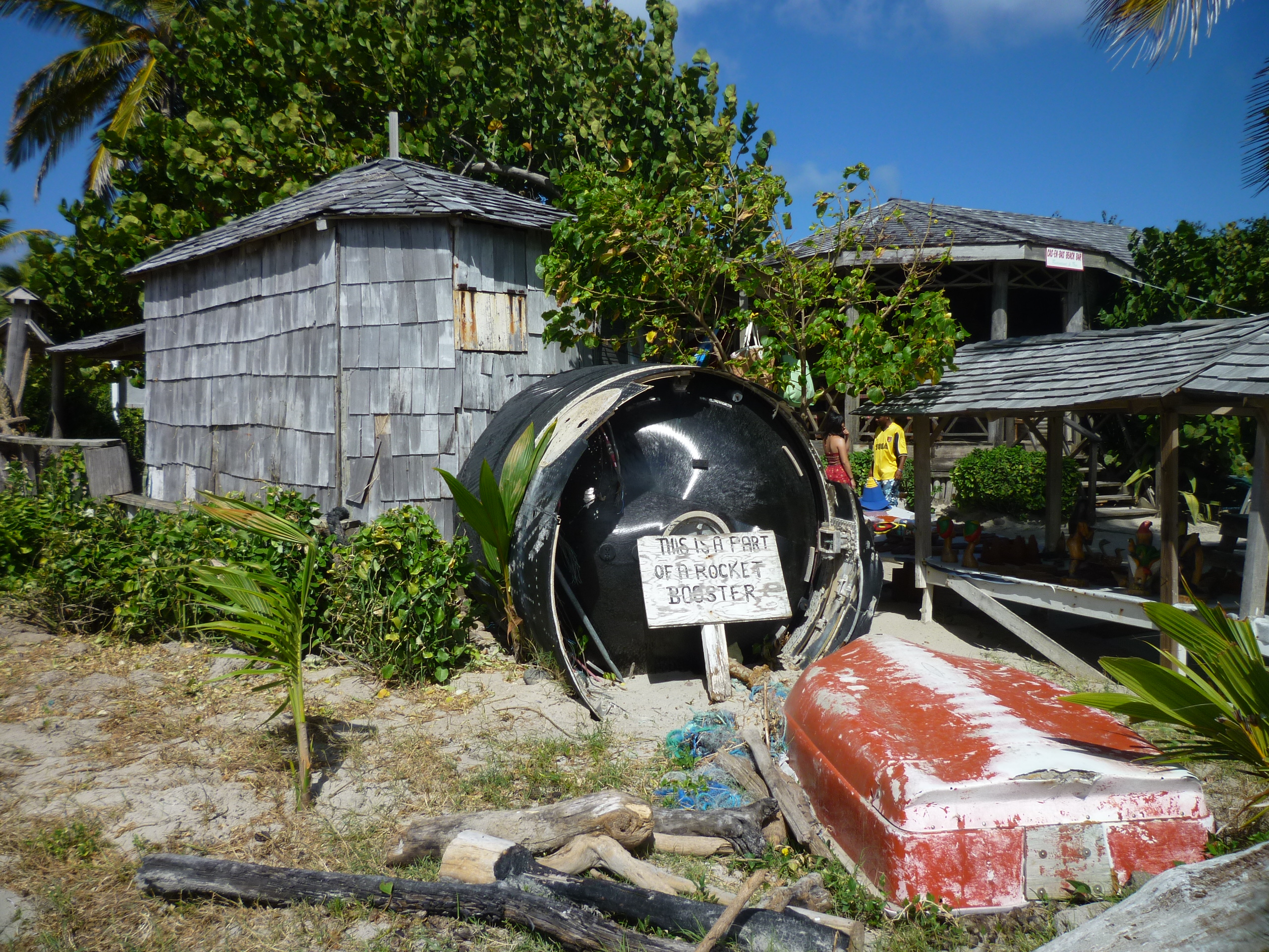 Parece ser que las partes que forman las distintas fases de los cohetes no siempre caen en mitad del océano. La de la foto de arriba estaba arramblada en un lateral de un chiringuito playero de Cas en Bas, en la isla-estado caribeña de Santa Lucía. La pena es que no decía nada de cómo había llegado hasta allí.