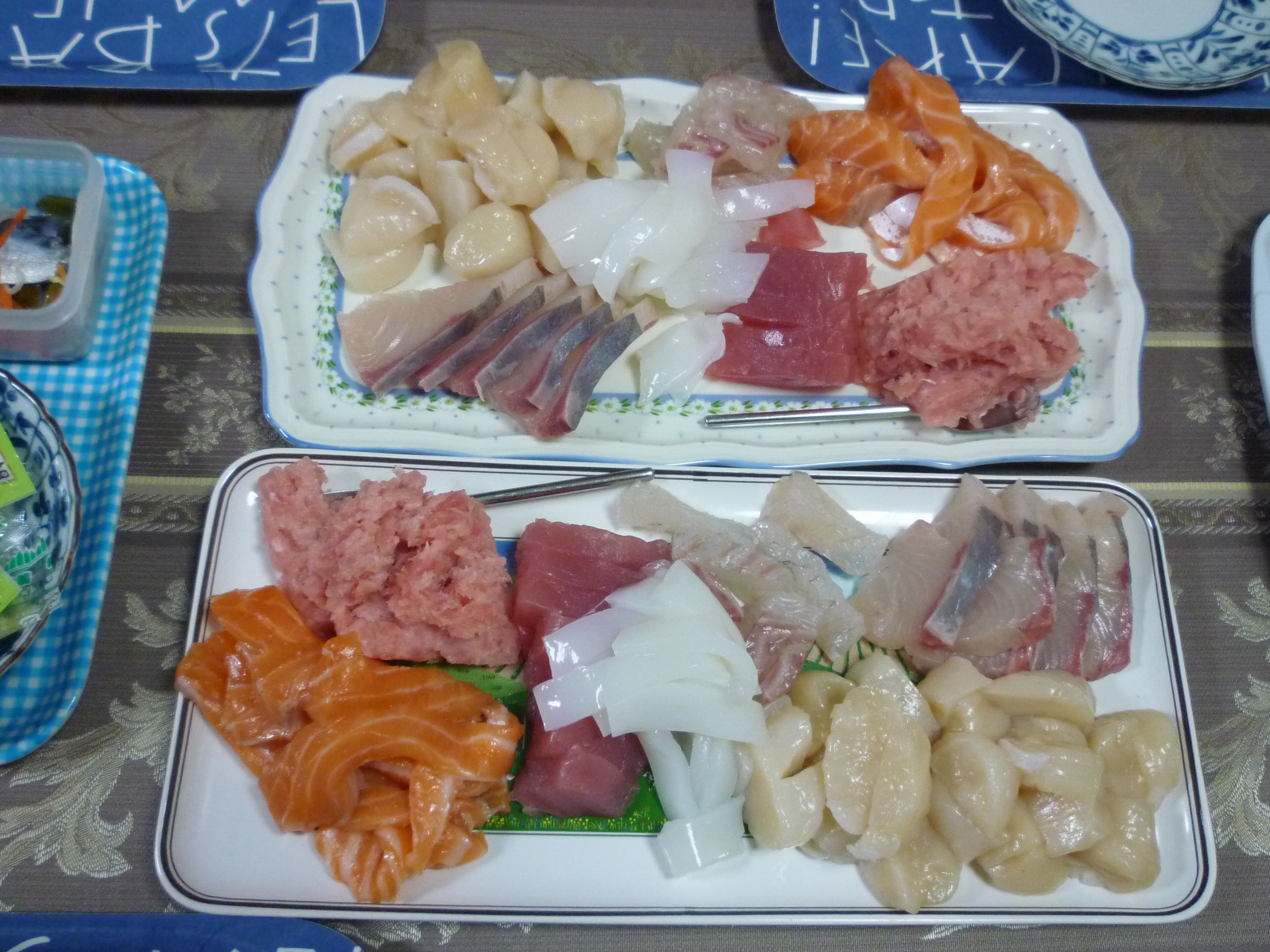 – Sashimi (刺身): son pequeños filetitos de pescado crudo que ocasionalmente pueden llevar un toque de plancha. El más común es el de atún rojo o salmón, pero los hay de muchos tipos de pescado. En los restaurantes suelen jugar mucho con la presentación cuando lo sirven (kaiseki). Se toma mojándolo en salsa de soja con wasabi, igual que el sushi. Las bandejas-surtido para llevar de los supermercados o puestecillos son muy populares entre los japoneses.
