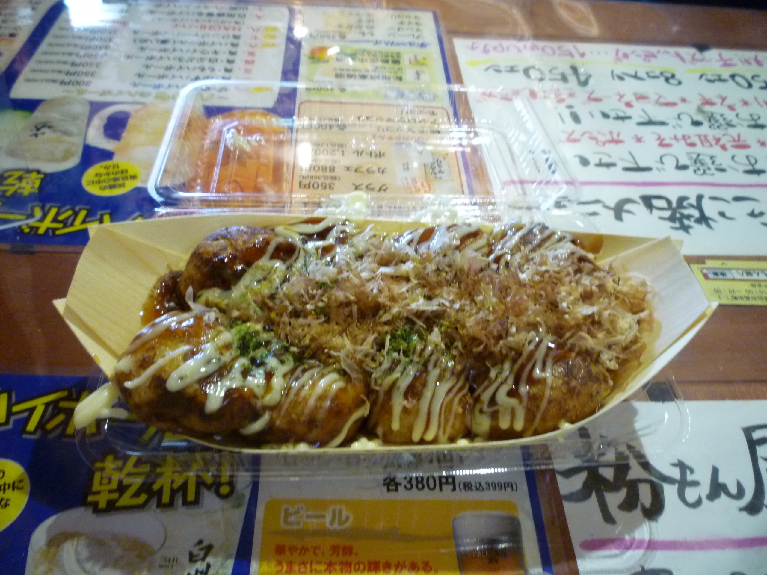 – Takoyaki (たこ焼き): es una especie de buñuelo relleno de pulpo (tako es pulpo en japonés), cebolleta y jengibre. La masa lleva harina, agua y huevo. Se fríen en una sartén especial que parece un cartón de huevos, que es lo que les da la forma redonda. Se adereza con las mismas cosas que el okonomiyaki y, al igual que éste, es originario de la zona de Kansai. Aparte de en tascas, los venden en puestecillos por la calle y los hacen para llevar.