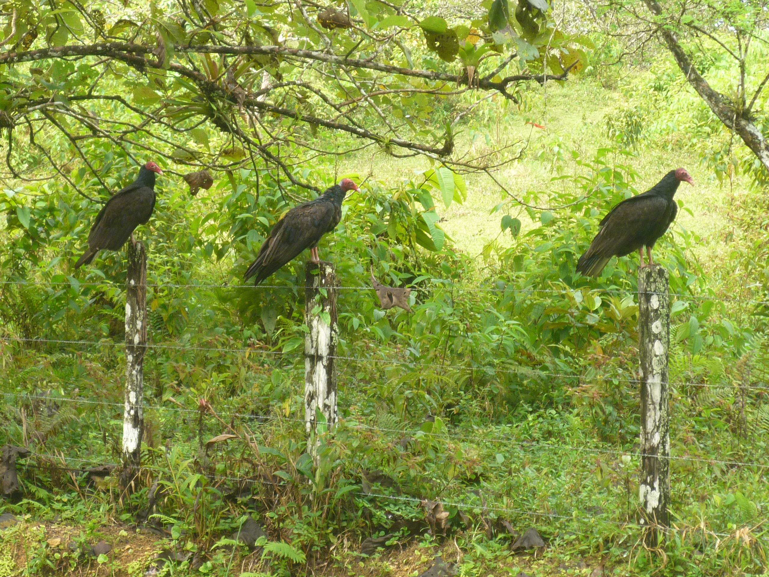 – El paseo en bici es bonito, atravesando paisaje tropical denso y compacto. La primera parte tiene un perfil ascendente suave y paramos a descansar al llegar a la cima. Nos reímos al ver tres buitres descansando sobre una valla a pocos metros, quizás esperando a que nos fallen las fuerzas.