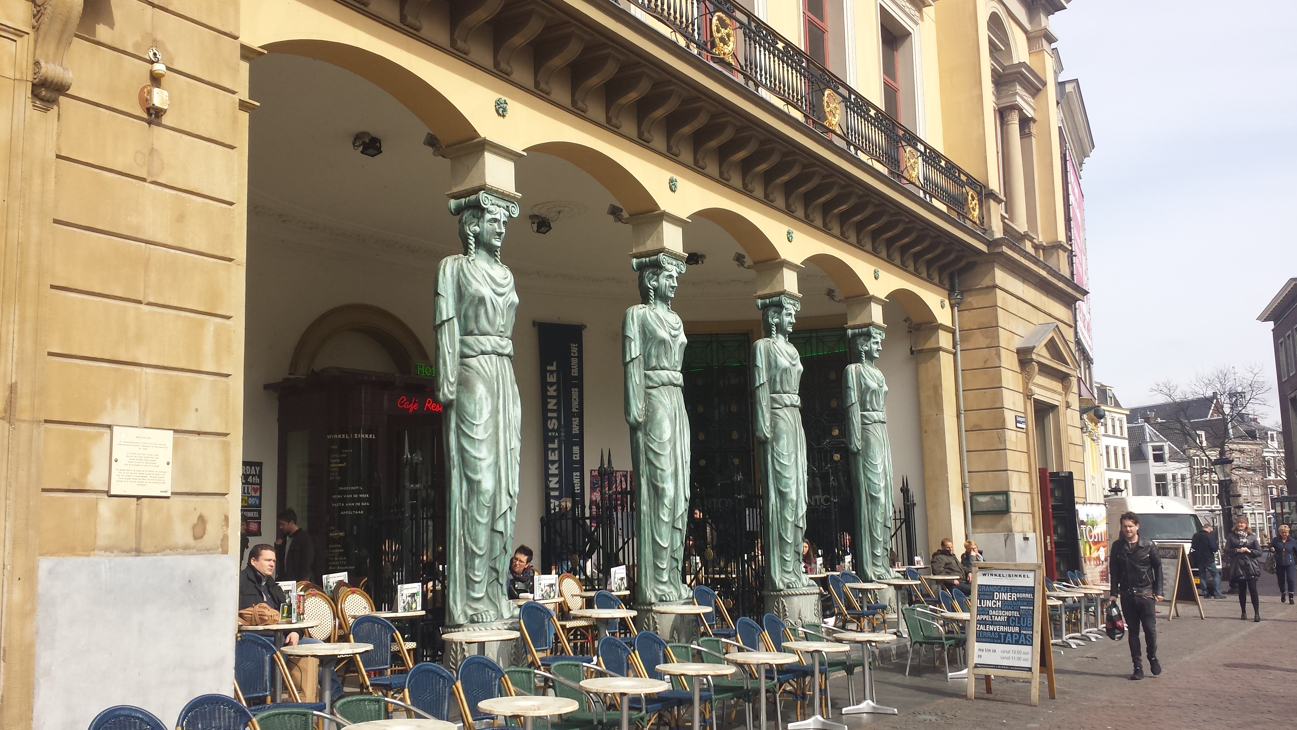 La otra es el Winkel van Sinkel, cuyo nombre viene de una canción infantil holandesa. Es fácilmente reconocible por las columnas en forma de cariátides que sostienen su fachada de color crema. El interior es sorprendentemente amplio y con cierto aire kitsch. Precisamente en el WvS aprendí una curiosa costumbre holandesa: al sentarse en una terraza todos lo hacen mirando hacia la calle, aunque eso suponga darle la espalda a algunos de los que van contigo. Cuando me senté de cara a ellos me dijeron en el estilo franco y directo marca de la casa: “ya te veo el careto todo el día en la oficina, ahora quiero ver a la gente que pasa por la calle, así que date la vuelta”. Con el tiempo te acostumbras y acabé cogiéndole el gusto.