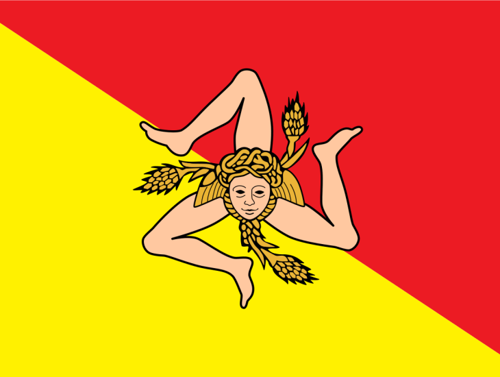 - La bandera de Sicilia tiene de fondo los colores rojo y amarillo que representan, respectivamente, a las ciudades de Palermo y Corleone. En el centro aparece un trisquel formado por tres piernas flexionadas con la cabeza alada de Medusa en su centro, un símbolo que ya aparecía en monedas acuñadas en Siracusa en el siglo IV antes de Cristo. La cabeza de Medusa está rodeada de tres espigas de trigo que simbolizan la fertilidad de la tierra de la isla.