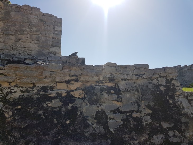 Aunque ya de por sí las ruinas son magníficas, lo que hizo de Tulum un sitio inolvidable para mí fue la posibilidad de darse un baño en la preciosa playa de arena fina y con palmeras que está dentro del yacimiento, y a la que se baja por unas escaleras situadas cerca de El Castillo ¡Pase lo que pase no os olvidéis de llevar un bañador! El día de la visita hacía muchísimo calor a pesar de ser la primera semana de diciembre, el agua estaba perfecta de temperatura y hasta había olas. Otra de las atracciones de Tulum es la gran cantidad de iguanas que pululan por el recinto arqueológico.