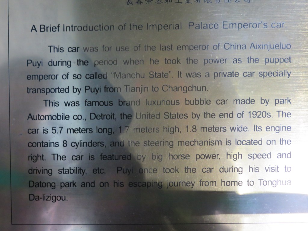 Parte del mérito de lo expuesto anteriormente es que si intentas averiguar algo sobre el coche con la información que dan en el museo, es un punto de partida complicado porque está plagada de errores: dice que la marca es Park Automobile Company de Detroit, que lo construyeron a finales de los 20 y que fue llevado a Changchun desde la residencia en la que Puyi vivió en Tianjin tras su expulsión de la Ciudad Prohibida.
