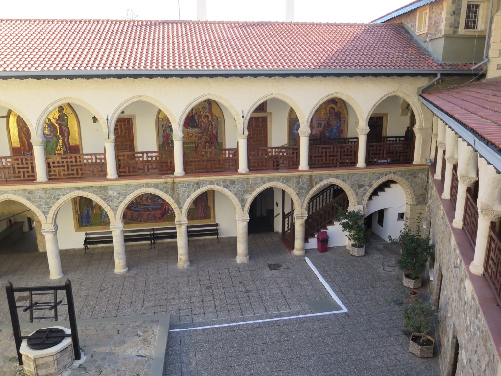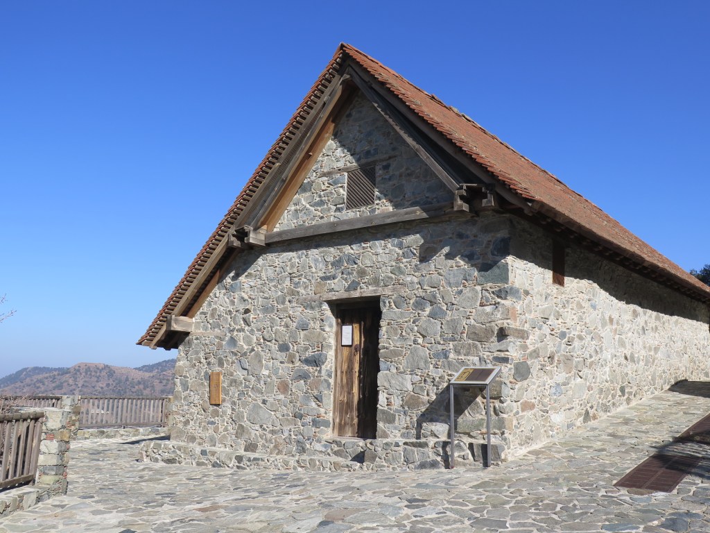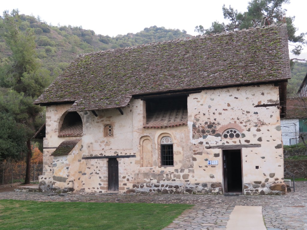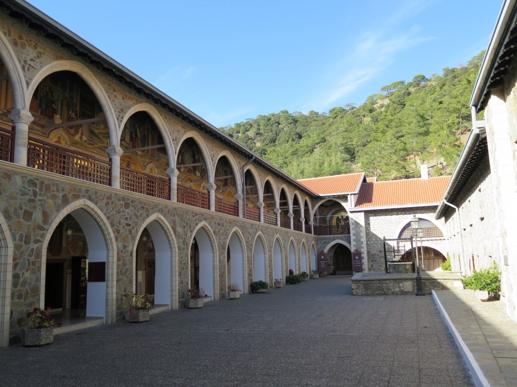 La primera parada fue en el Monasterio de Kikkos (no es uno de los de la lista PdH), a unos 74Km de Pafos, de los que los primeros 40 son por autopista y después se pasa a una carretera de montaña en muy buen estado pero muy virada (1h30’ en total). Fundado a finales del siglo XI, ha sido destruido y reconstruido numerosas veces, el edificio actual es bastante reciente y todo tiene aspecto de ser nuevo, especialmente los frescos. La entrada y la visita son libres y abre durante las horas de luz solar. Es un lugar bonito y luminoso en un entorno ideal, pero con 20 minutos da para verlo bien. Junto al monasterio, en lo alto de una colina, está el mausoleo del arzobispo y presidente Makarios III, considerado el Padre de la Patria por los greco-chipriotas. Hay una estatua suya y una pequeña capilla, pero lo mejor sin duda son las vistas de las montañas y bosques de los alrededores.