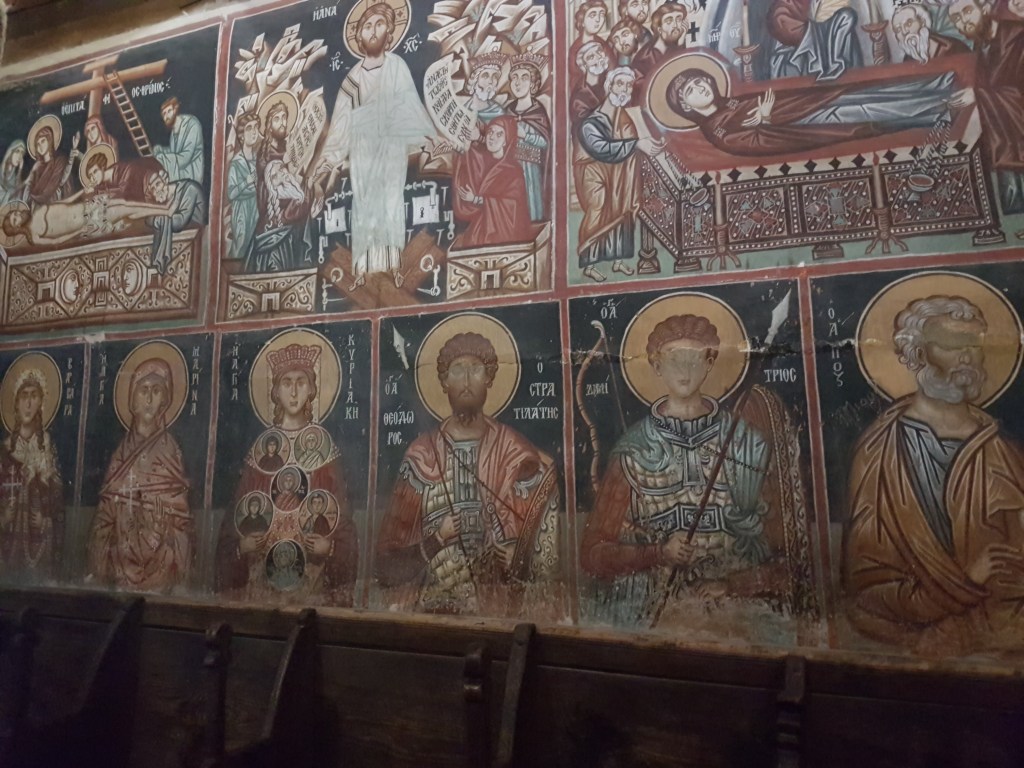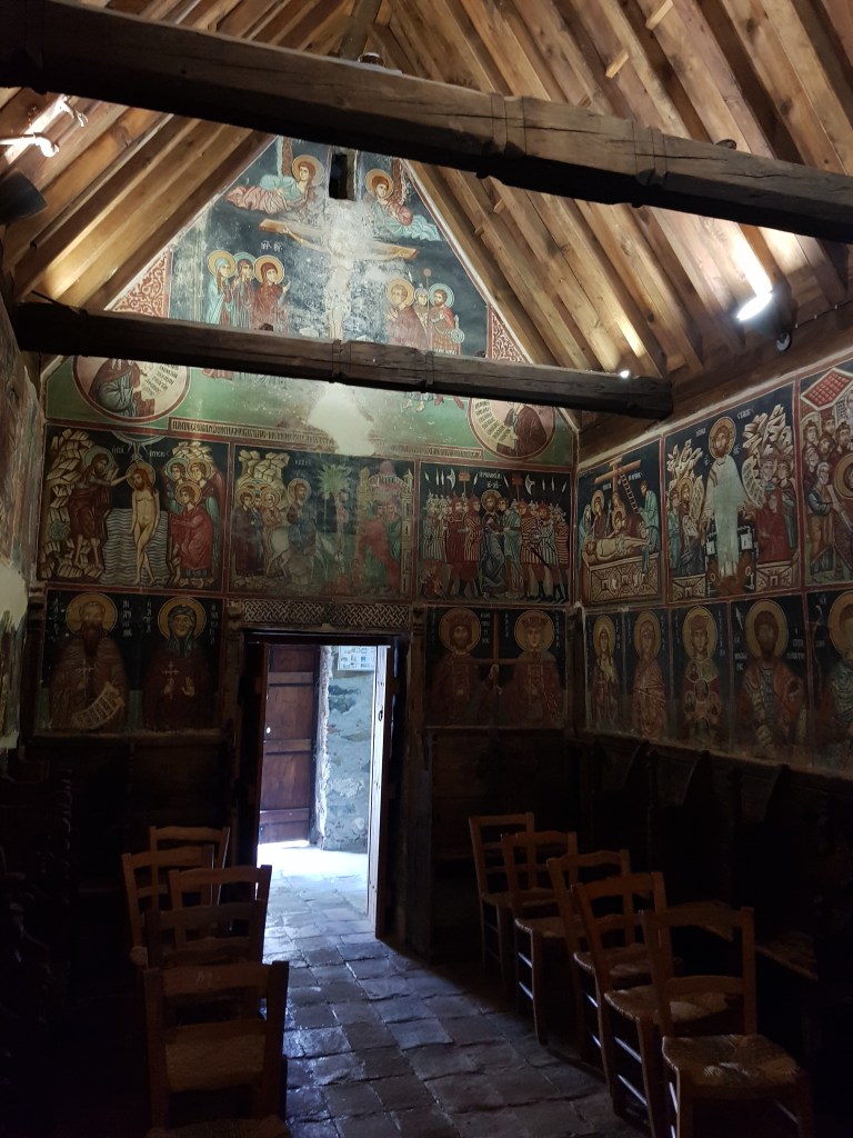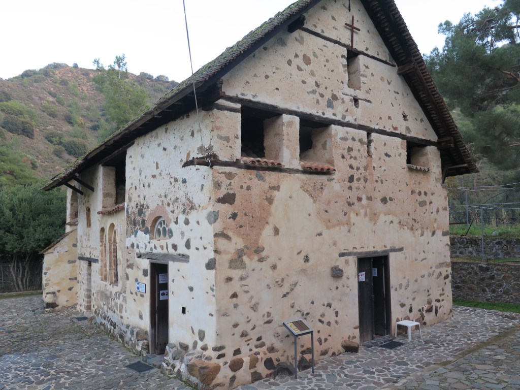 De entre las iglesias pintadas tuvimos tiempo de visitar cuatro de ellas, la entrada es gratis en todas siempre con la opción de dejar una donación: Archangelos Michael (pequeña, llamativa, con un tejado que llega hasta el suelo en uno de los lados, los frescos son una maravilla y están muy bien conservados, si la puerta está cerrada hay que pedir las llaves en el contiguo museo bizantino). Capilla de Panagia en Moutoullas (no tan bonita como la anterior y con frescos estupendos pero peor conservados). Agios Nikolaos tis Stegis (apartada en un lateral del pueblo, daba la sensación de estar algo dejada, estaba a oscuras y tuvimos que encender las luces y apagarlas al salir, los frescos, aunque deteriorados eran fantásticos). Aun nos dio tiempo a pasarnos por Panagia Podithou, pero solo pudimos verla por fuera porque se suponía que cerraban a las 4pm pero pese a llegar 10 minutos antes ya no pudimos entrar.