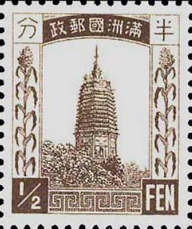 1932. El primer sello emitido por el estado de Manchukuo fue en en julio de 1932, cinco meses después de su fundación y en él salía la Pagoda Blanca de Liaoyang. Los 5 caracteres situados en la parte de arriba dicen “Administración Postal del Estado Manchú”. Hubo otra serie ese mismo año con el retrato del Jefe del Estado, Aisin-Gioro Puyi, el que había sido el último emperador de China.