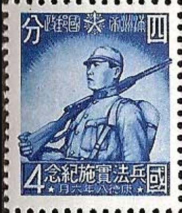 1941. Este sello que muestra a un soldado con un rifle alude a la Ley de Reclutamiento Nacional de noviembre del año anterior, que obligaba a los jóvenes locales a servir en el Ejército de Manchukuo. Este era relegado a tareas menores y denostado por los militares japoneses, ya que desconfiaban de los soldados “manchukuanos”.