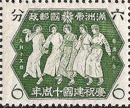 1942. Con Japón en el punto álgido de su gloria militar, se celebró por todo lo alto el décimo aniversario de la fundación de Manchukuo y se emitieron varios sellos para conmemorar el evento (también hubo una serie en Japón). En este se vuelve a incidir en el tema de la armonía entre las 5 razas que habitaban Manchukuo (chinos, manchúes, japoneses, coreanos y mongoles), cada una representada por una campesina que baila en el traje típico de su nacionalidad.