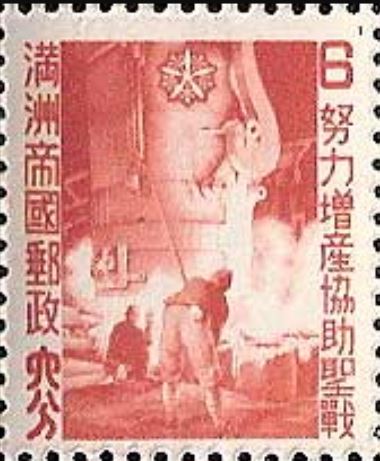 1943. Este sello conmemora el segundo aniversario de la entrada de Japón (y por ende de Manchukuo) en la Segunda Guerra Mundial (conocida allí como la Gran Guerra Asiática), con el propósito de promover el incremento de la producción industrial. La imagen es de la Fundición de Acero Showa en Anshan, emblema de la industria pesada de Manchukuo desde hacía décadas.
