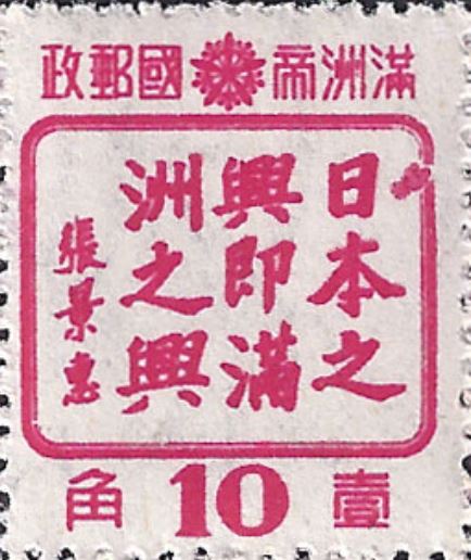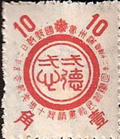 1945. El último sello emitido en la historia de Manchukuo fue en mayo del mismo año de su desaparición. Conmemora el décimo aniversario del Decreto Imperial publicado por Puyi. La frase contenida en el círculo dice: “Una virtud, un alma”, proclamando y promoviendo la (inexistente) unidad entre los habitantes de Manchukuo.