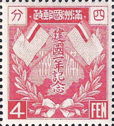 1933. Este sello salió el 1 de marzo para conmemorar el primer aniversario de la fundación de Manchukuo y muestra el mapa del estado y la bandera nacional. Es un buen ejemplo del uso de propaganda buscando legitimidad tanto internacional como dentro de sus fronteras.