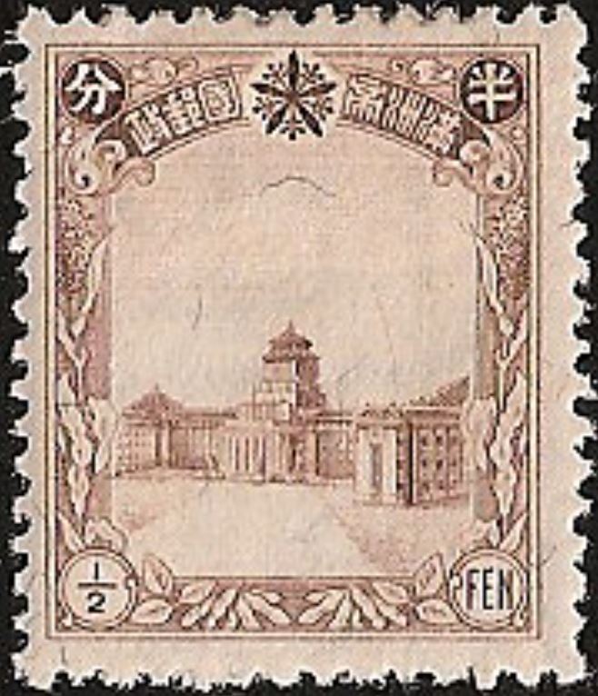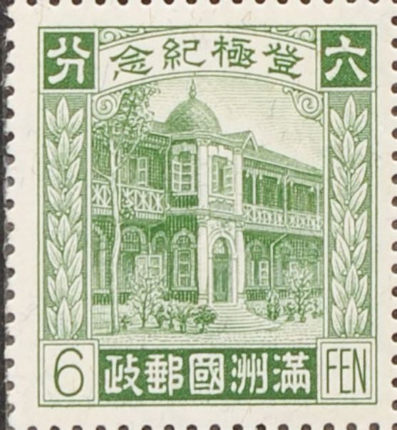 1936. Este año se terminó la construcción en la capital, Hsinking (actual Changchun), del edificio emblemático de la pujanza de Manchukuo, el Consejo de Estado, y fue conmemorado con este sello. En la actualidad sigue en uso y es una facultad perteneciente a la universidad de Jilin.