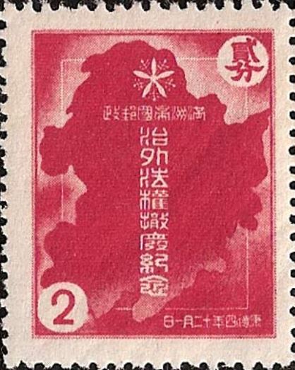 1937. Este es uno de la serie de 6 sellos que conmemoraban la (teórica) abolición oficial de los derechos extraterritoriales japoneses en Manchukuo. Por supuesto no era más que propaganda, porque el Ejército de Kwantung y Japón seguían controlando el país con puño de hierro.