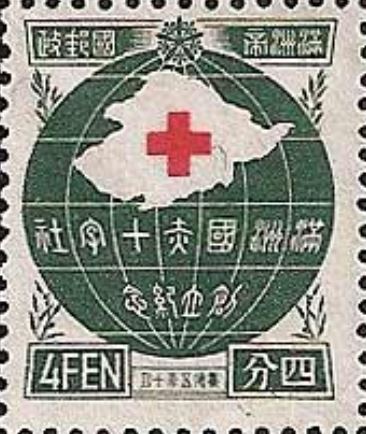 1938. Este sello conmemora la fundación de la Cruz Roja de Manchukuo. Hasta ese momento los servicios médicos los había proporcionado la Cruz Roja Japonesa, que en una ceremonia celebrada en octubre les cedió sus hospitales y equipo. Además, fueron los primeros sellos de los que hubo preventa para coleccionistas.