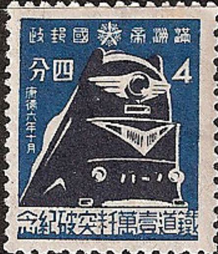 1939. El tren fue la principal herramienta colonial de Japón en Manchuria primero y en Manchukuo después, así como un icono de su modernidad. Se hicieron 2 sellos para celebrar el hito del kilómetro 10.000 de vía férrea. En este sale la joya de la corona de la South Manchurian Railway: el Asia Express, el tren más moderno y lujoso de su época en todo el mundo.