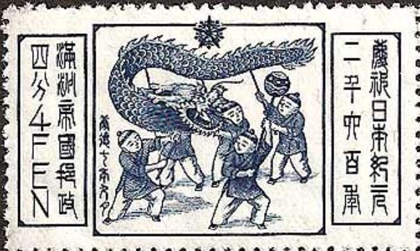 1940. Un tema recurrente y cambiante en la propaganda de Manchukuo durante toda su existencia fueron los lazos con Japón, país que primero fue «amigo fraternal», luego «hermano mayor» y, finalmente, «padre». Este sello fue emitido para conmemorar el 2600 aniversario de la creación de Japón.