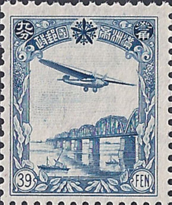 Y terminamos con uno de propina. En 1936, 1937 y 1939 se emitieron dos sellos específicos para el correo aéreo. En este, un avión bimotor sobrevuela el puente ferroviario que construyeron los rusos sobre el río Songhua en Harbin. Si encontráis alguno con el avión dado la vuelta me lo guardáis por favor 🙂