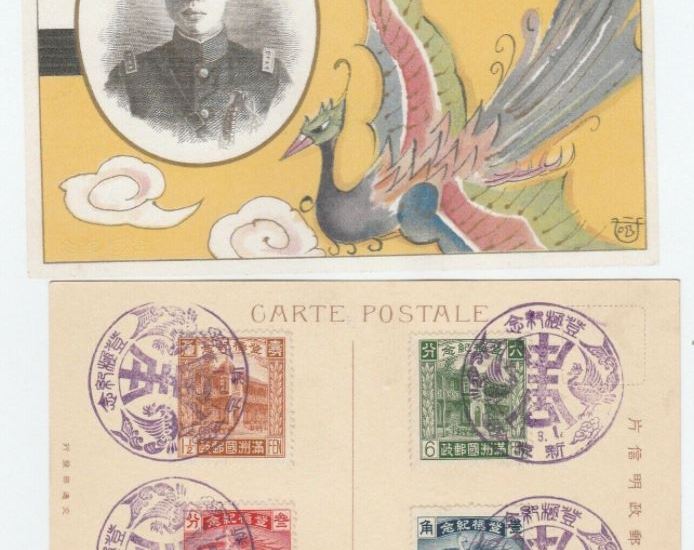 1935. Por razones obvias China no reconocía a Manchukuo como un estado independiente, por lo que se tuvo que crear un sello especial para el correo destinado a China que omitía la palabra “Manchukuo” y simplemente decía “Servicio Postal”. Además, fue el primero en el que figuraba la orquídea símbolo de la casa imperial, omnipresente después en el resto de emisiones.